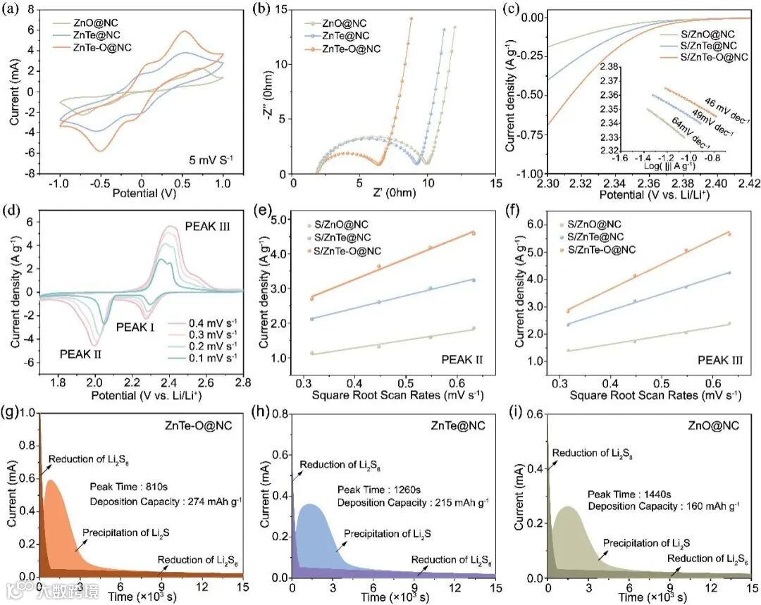 图3. (a) Li2S6对称电池的CV曲线。(b)对称电池的EIS光谱。(c)线性扫描伏安(LSV)曲线和Tafel图。(d)与S/ZnTe-O@NC阴极锂硫电池CV曲线。(e) PEAKⅡ(Li2S4-Li2S)和 (f) PEAKⅢ(Li2S-S8)的峰值电流随扫描速率平方根的变化图。(g) ZnTe-O@NC, (h) ZnTe@NC和 (i) ZnO@NC电极Li2S成核动力学分析。