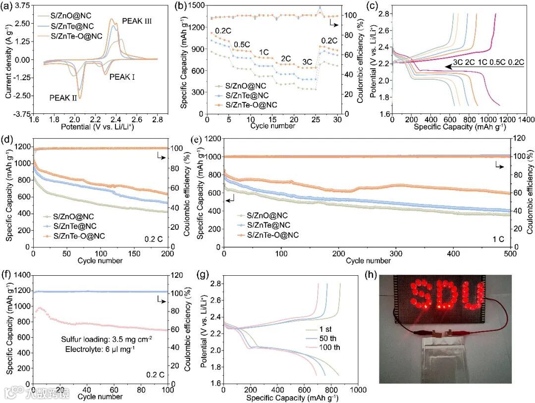 图4. (a) 0.1 mV s−1扫速下的CV曲线。(b)速率性能。(c) ZnTe-O@NC电极在不同电流速率下的GCD谱图。(d) 0.2 C下的循环性能。(e) 1 C下的长循环性能。(f) 载硫量为3.5 mg cm−2时Li-S电池循环性能及 (g) 充放电曲线。(h)袋式电池点亮发光二极管的照片。