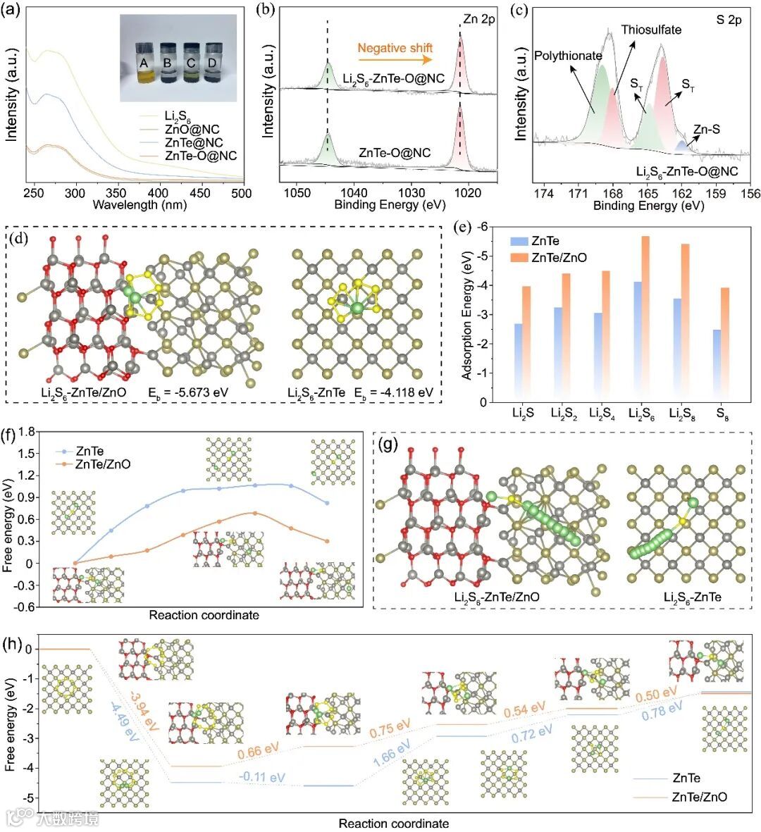 图2. (a) 静置3 h后Li2S6溶液的紫外可见曲线和相应的光学照片(从a到D: Li2S6溶液,ZnO@NC, ZnTe@NC和ZnTe-O@NC) b) Li2S6吸附前后ZnTe-O@NC的高分辨率Zn 2p光谱。(c) Li2S6−ZnTe-O@NC的S 2p谱。(d) Li2S6在ZnTe和ZnTe−ZnO异质结表面上的吸附模型。(e) ZnTe@NC和ZnTe−ZnO异质结表面对多硫化物的结合能。(f) Li2S在ZnTe@NC和ZnTe−ZnO异质结表面上的分解能垒 (插图为初始、过渡和最终优化的吸附结构)。(g) Li2S在ZnTe和ZnTe−ZnO异质结表面的分解示意图。(h) ZnTe和ZnTe−ZnO异质结表面多硫化物转换的吉布斯自由能图。