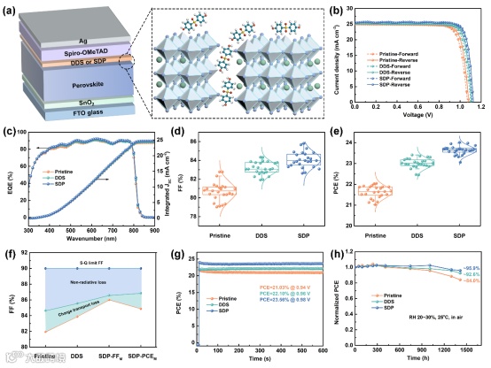此外,DDS和SDP诱导的永久偶极子效应改善了能量排列,促进了电荷转移,减少了载流子复合。因此,SDP处理的器件实现了86.0%的填充因子(FF)和24.39%的功率转换效率(PCE)。此外,SDP处理显著提高了湿度稳定性,设备在环境空气储存1400小时后保持了95.9%的初始效率。在最大功率点跟踪(MPPT)下连续照明200小时后,未封装的PSCs仍保持96%的原始效率。