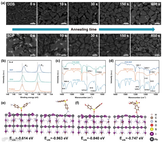 要点二:扫描电子显微镜(SEM)观察了钙钛矿膜在不同退火时间下的形态演变。DDS处理的样品在退火的初始阶段,完全包裹在钙钛矿膜的表面。随后,DDS逐渐向晶界迁移。相反,对于SDP处理的样品,SDP以“斑块”形状随机分布在钙钛矿表面,退火10秒后,一部分SDP向晶界间和表面晶界内迁移,而另一部分则保持不变。随着退火的进行,SDP完全迁移到晶界。这是由于钝化剂和IPA之间的溶剂相互作用驱动了钝化剂在退火过程中的迁移,最终导致选择性晶界改性。此外,DFT模拟为DDS和SDP选择性晶界改性的形成机制提供了额外的证据。