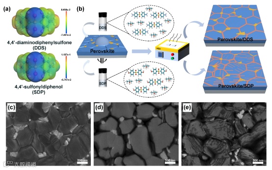 要点一:基于密度泛函理论(DFT)进行了理论计算,表明DDS/SDP中富电子和缺电子基团与铅和碘离子间存在强相互作用。利用扫描电子显微镜(SEM)观察了薄膜的表面形貌,SDP和DDS处理的钙钛矿膜显示出一层深对比度物质覆盖在晶界处,表明SDP和DDS覆盖在晶界,这与大多数现有的钝化剂处理钙钛矿薄膜整个表面的方法不同,我们使用DDS和SDP后处理的方法选择性地覆盖了晶界。