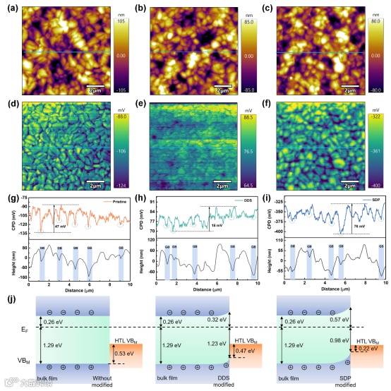 要点三:原子力显微镜(AFM)和开尔文探针力显微镜(KPFM)检测了DDS和SDP后处理前后钙钛矿膜的表面形貌和电位。DDS和SDP处理后,钙钛矿膜表面均方根(RMS)粗糙度分别从原始钙钛矿膜的41.82 nm降低到34.25 nm和32.45 nm。表面粗糙度的降低表明钝化剂有效地覆盖了晶界处的凹位置。原始样品、DDS处理和SDP处理样品的接触电位差(CPD)值分别为1057.00,764.07和36115.77 mV。此外,原始钙钛矿薄膜表现出均匀的CPD, GBs与相邻晶粒内部之间的CDP差异(ΔVCPD)为47 mV,经DDS和SDP后处理后,ΔVCPD值分别为18 mV和76 mV。考虑到更光滑的表面和改变的ΔVCPD,表明DDS和SDP后处理选择性地覆盖了钙钛矿膜中的GBs。