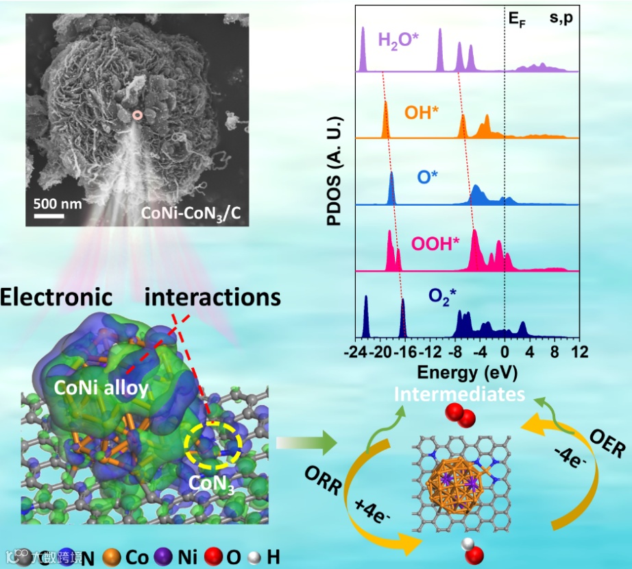 由于三配位CoN3基团的不对称电子态,使得反应中间体的吸附/解吸行为更容易受到调控,从而导致CoNi-CoN3/C催化剂的ORR活性异常高。相邻的CoNi合金影响了CoN3的电子结构,导致整个CoNi-CoN3复合位点的d波段中心有轻微的下移,从而提高了CoNi-CoN3/C催化剂的OER性能。CoNi合金纳米颗粒与CoN3基团之间在电子结构和反应趋势方面的强相互作用协同优化了ORR和OER反应动力学。