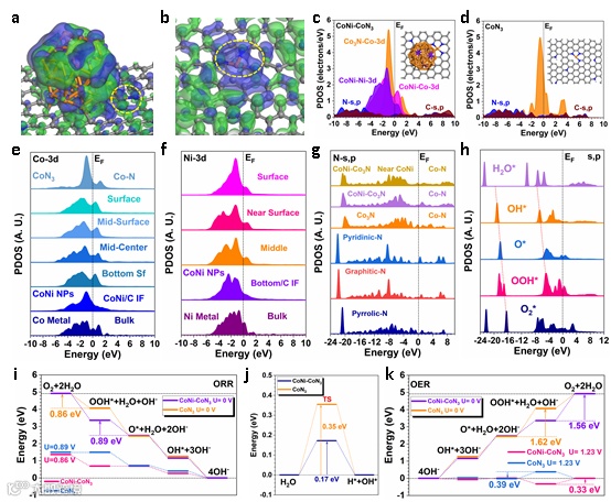 要点三:理论计算揭示CoNi-CoN3复合位点中CoNi合金和CoN3之间的相互作用机制