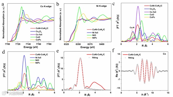 利用基于同步辐射的X射线吸收精细结构(XAFS)谱鉴定了CoNi-CoN3/C中金属原子的局部化学环境。图1a显示了CoNi-CoN3/C和Co箔、CoO、Co3O4和CoPc的Co K-edge X射线吸收近边缘结构(XANES)光谱。CoNi-CoN3/C的吸附边位于Co箔和Co3O4的吸附边之间,说明CoNi-CoN3/C中Co的价态介于零价(Co0)和氧化Co+8/3之间。与Co元素不同,CoNi-CoN3/C中的Ni元素基本以零价(Ni0)的形式存在。FT-EXAFS光谱显示,Co-K边的主峰约为1.43和2.11 Å,分别属于Co-N和Co-Co/Ni; 而Ni-K边在2.16 Å处的主峰为Ni-Ni/Co配位。拟合结果显示(图1e, f),Co原子的配位数为~3,表明形成了近似的CoN3配位。此外,相比与于Co箔和Ni箔,CoNi-CoN3/C中相邻的Ni-Ni/Co和Co-Co/Ni壳的配位数分别为7.9±0.2和4.8±0.2,表明CoNi-CoN3/C中部分Co和Ni以合金纳米粒子的形式存在。综上所述,在N掺杂的超薄碳纳米片基底中成功地形成了由CoNi合金NPs和CoN3组成的CoNi-CoN3复合位点。