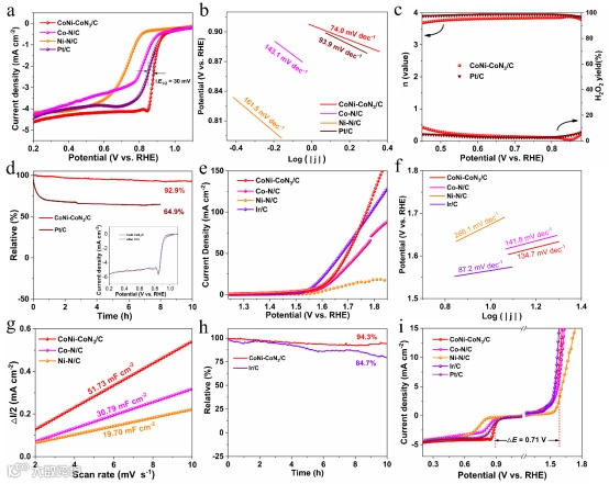 在0.1 M KOH中考察了催化剂的ORR活性。如图2a所示,CoNi-CoN3/C的半波电位(E1/2)为0.88 V,高于Pt/C(0.85 V)、Co-N /C ((0.81 V)和Ni─N/C (0.73 V),表明CoNi-CoN3/C具有较强的ORR活性。与Pt/C (93.9 mV dec−1)和对照样品相比,CoNi-CoN3/C的Tafel斜率最小,为74.0 mV dec−1(图2b),显示出良好的ORR动力学。图2c表明,在0.45-0.88 V的电位范围,CoNi-CoN3/C的过氧化氢产率低于10.7%,显示出较高的ORR选择性。计算出CoNi-CoN3/C的电子转移数为~4,揭示了有效的4e−转移机制。此外,CoNi-CoN3/C表现出出色的稳定性,连续测试10小时后电流保持率高达92.9%。稳定性测试前后几乎不变的ORR极化曲线表明,CoNi-CoN3/C催化剂具有出色的性能再现性(图2d)。