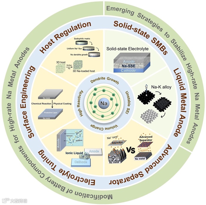 本文首先概括了钠金属负极在大电流下应用所面临的严峻挑战;然后全面讨论了实现钠金属负极大电流下长期循环稳定性的常规策略及新兴策略,以及它们的潜在机理、电化学性能及实际可能的应用;最后,提出了有关进一步推进大电流钠金属负极实际应用的展望。
