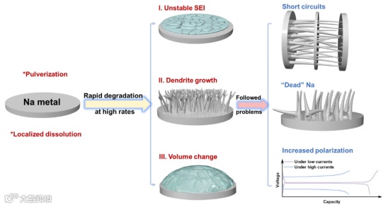 图1. 大电流下钠金属负极的关键挑战以及相应的负面影响示意图。