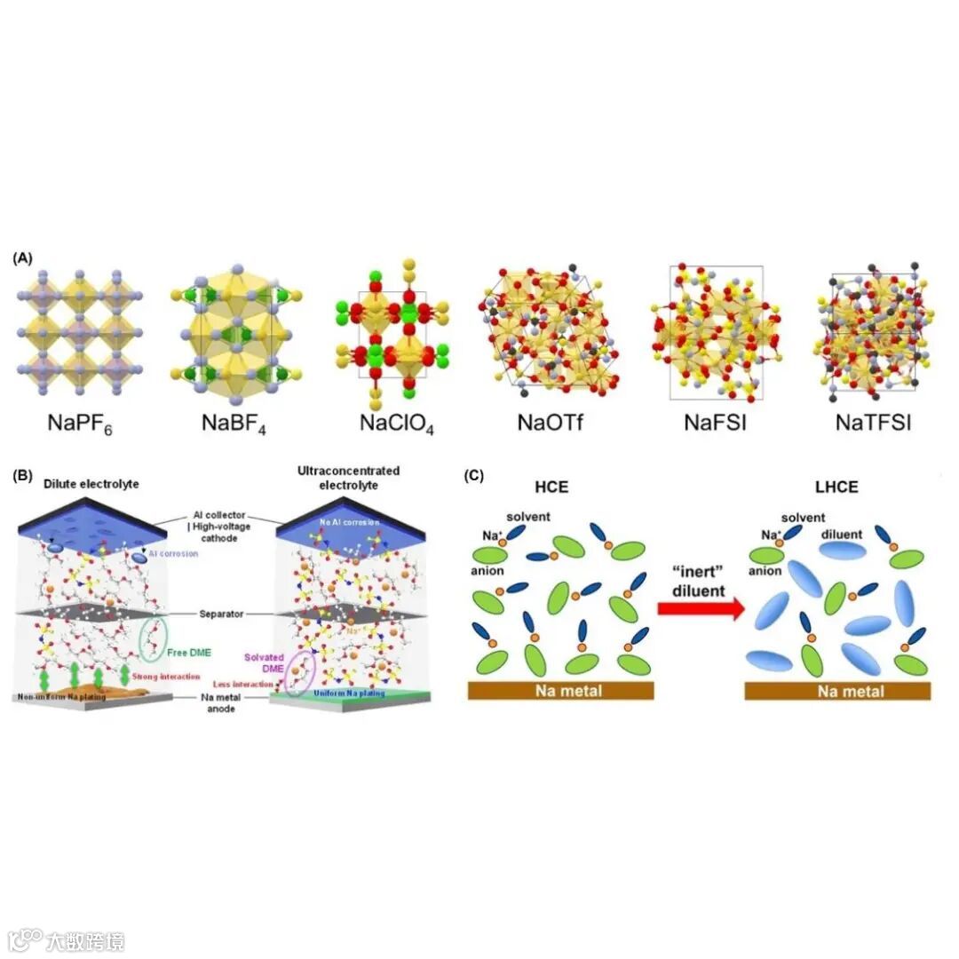 图3. (A) Materials Project数据库中典型钠盐的三维晶体结构;(B) 钠在稀释和超浓缩电解液中的电镀过程示意图;(C) 从高浓度电解液到局部高浓度电解液的稀释过程示意图。