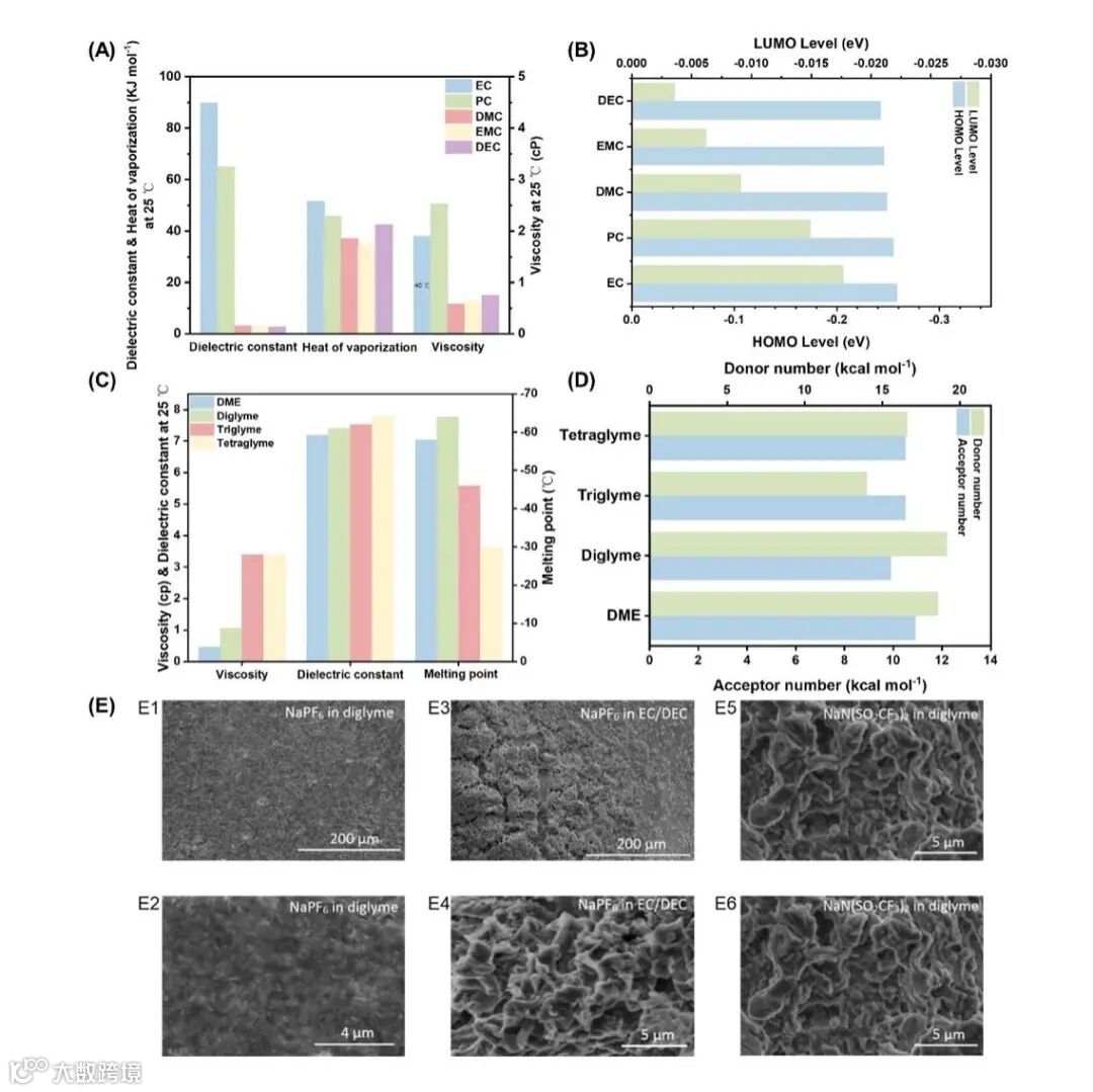 图2. (A、B)碳酸盐基溶剂和(C、D)醚基溶剂的基本特性;(E) 在醚基和碳酸酯基电解质中循环后钠表面的扫描电镜图像。使用1 M NaPF6 in diglyme进行全循环后,钠金属负极表面的扫描电镜图像,(E1)为低倍,(E2)为高倍;(E3、E4)和(E5、E6)分别是在1 M NaPF6 in EC:DEC 1:1 vol%和1 M NaN(SO2CF3)2 in diglyme电解液中完全循环后钠负极表面相应的低倍/高倍扫描电镜图像;(E)在0.5 mA cm–2和1 mA h cm–2的循环后的钠金属负极扫描电镜图像。