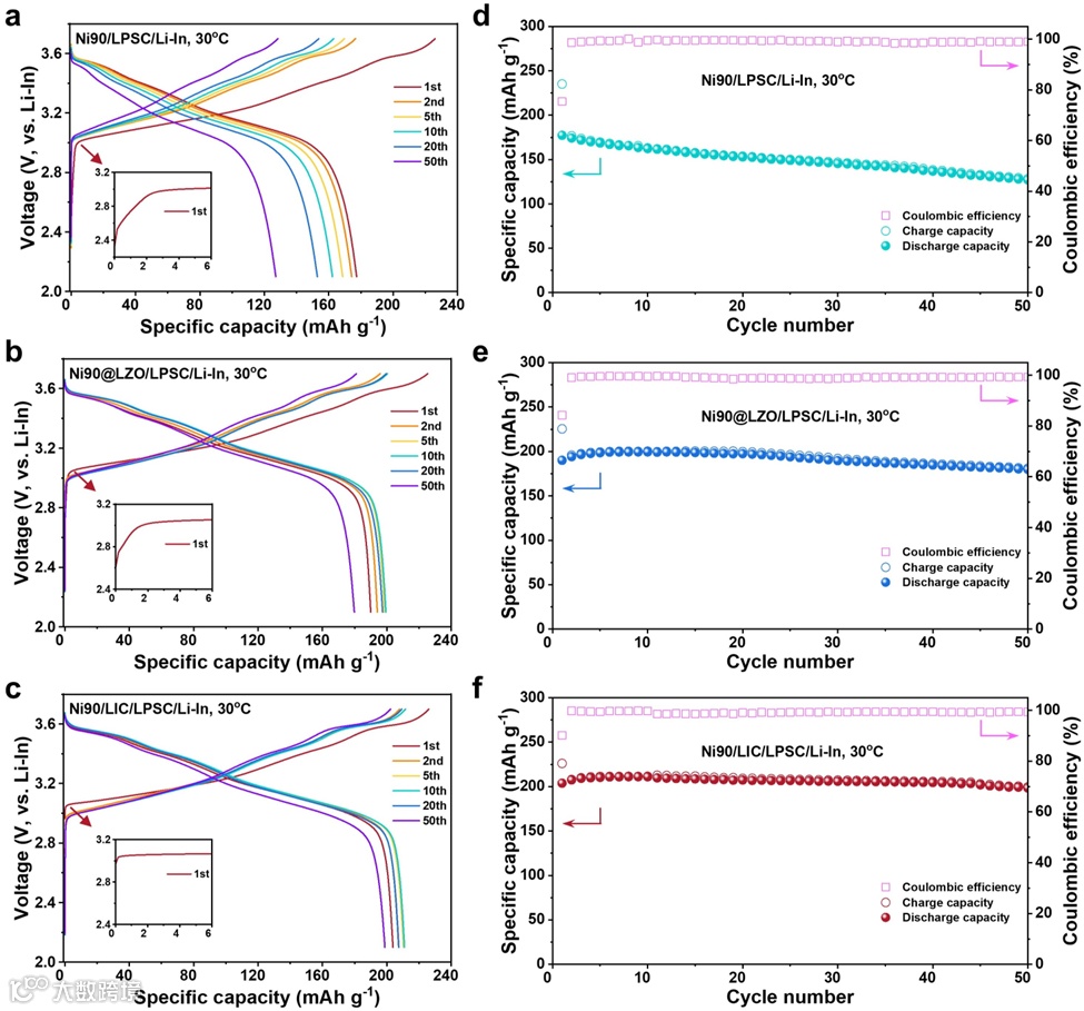 图1 Ni90复合正极的长周期循环性能。a-c,(a) Ni90/LPSC/Li-In,(b) Ni90@LZO/LPSC/Li-In 和 (c) Ni90/LIC/LPSC/Li-In ASSB在0.1C(1C=200 mA g-1)和30°C下的充放电曲线。插图显示了首次充电过程的放大区域。d-f,(d) Ni90/LPSC/Li-In,(e) Ni90@LZO/LPSC/Li-In 和 (f) Ni90/LIC/LPSC/Li-In ASSB在0.1C(1C=200 mA g-1)和30°C下的长期循环稳定性。