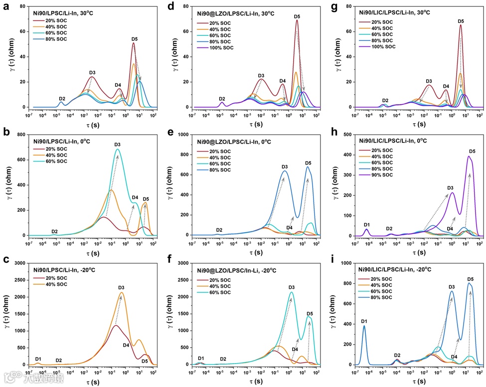 图3 Ni90复合正极阻抗随SOC的演变。a-c,Ni90/LPSC/Li-In ASSB的DRT结果,在不同SOC(即20%、40%、60%或80%)下的(a) 30°C,(b) 0°C和(c) -20°C。d-f,Ni90@LZO/LPSC/Li-In ASSB的DRT结果,在不同SOC(即20%、40%、60%、80%或100%)下的(d) 30°C,(e) 0°C和(f) -20°C。d-f,Ni90/LIC/LPSC/Li-In ASSB的DRT结果,在不同SOC(即20%、40%、60%、80%、90%或100%)下的(g) 30°C,(h) 0°C和(i) -20°C。