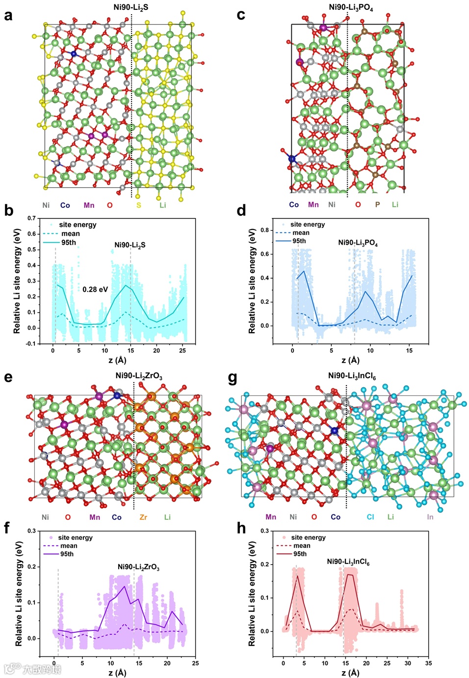 图5 界面能垒的理论评估。a、c、e和g,Ni90-Li2S、Ni90-Li3PO4、Ni90-Li2ZrO3和Ni90-Li3InCl6界面在 400 K下经过10 ps AIMD模拟后的结构。灰色、深蓝色、深紫色、红色、黄色、绿色、棕色、橙色、青色和浅紫色的球分别代表Ni、Co、Mn、O、S、Li、P、Zr、Cl和In原子。垂直的黑色虚线表示Ni90正极和界面的边界。b、d、f 和 h,(b) Ni90-Li2S、(d) Ni90-Li3PO4、(f) Ni90-Li2ZrO3和(h) Ni90-Li3InCl6界面沿z轴方向的Li位点能分布。垂直的灰色虚线表示两个界面的边界。在(b)、(d)、(f) 和 (h) 图的背景中,实心圆点代表相对Li位点能。Li位点能的平均值和第95百分位值表示相同z轴坐标的平均值和第95百分位值。