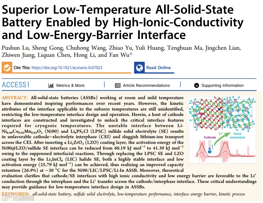 该成果以“Superior Low-Temperature All-Solid-State Battery Enabled by High-Ionic-Conductivity and Low-Energy-Barrier Interface”为题发表在国际知名期刊ACS Nano (IF=18.0),通讯作者为中国科学院物理研究所吴凡研究员,第一作者为中国科学院物理研究所博士毕业生、宁波东方理工大学博士后卢普顺。