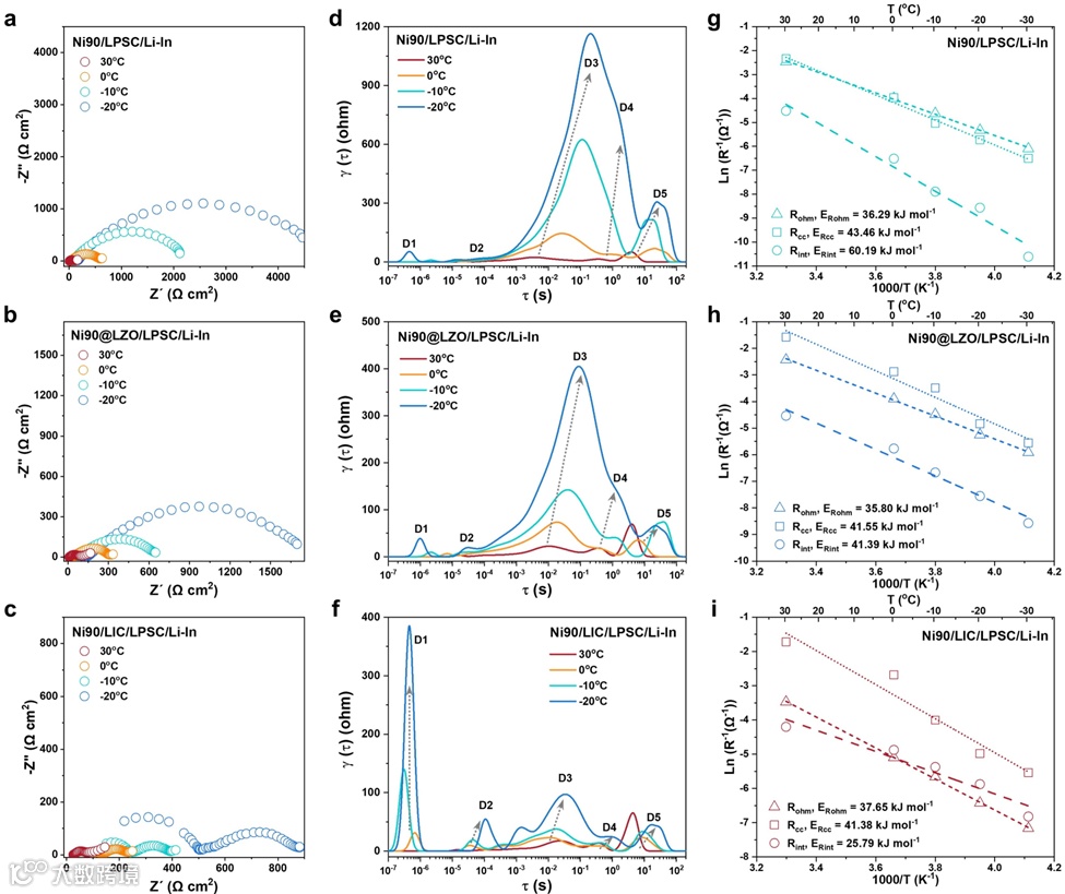 图4 Ni90复合正极阻抗随温度的演变。a-c, 显示了(a)Ni90/LPSC/Li-In、(b)Ni90@LZO/LPSC/Li-In 和(c)Ni90/LIC/LPSC/Li-In ASSBs 在 20% SOC 和不同温度下(即 30、0、-10、-20℃)的 Nyquist 图。请注意,这里的数据已按面积(0.7854 cm2)归一化,并以 Ω cm2 为单位绘制。从(a)-(c)中转换得到的 DRT 结果,用于(d)Ni90/LPSC/Li-In、(e)Ni90@LZO/LPSC/Li-In 和(f)Ni90/LIC/LPSC/Li-In ASSBs。对于(g)Ni90/LPSC/Li-In、(h)Ni90@LZO/LPSC/Li-In 和(i)Ni90/LIC/LPSC/Li-In ASSBs,显示了欧姆电阻(Rohm)、正极接触电阻(Rcc)和界面电阻(Rint)与工作温度的阿伦尼乌斯关系。