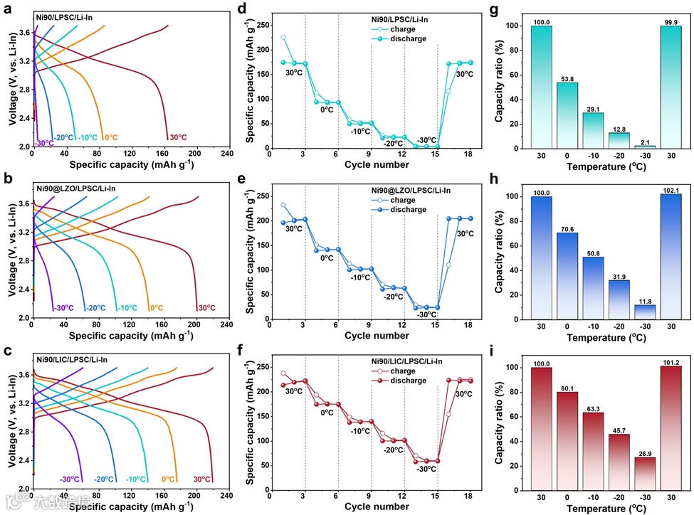 图2 Ni90复合正极的低温性能。a-c,(a) Ni90/LPSC/Li-In、(b) Ni90@LZO/LPSC/Li-In和(c) Ni90/LIC/LPSC/Li-In ASSB在-30~30℃范围内第二次循环的充放电曲线。d-f,(d) Ni90/LPSC/Li-In、(e) Ni90@LZO/LPSC/Li-In和(f) Ni90/LIC/LPSC/Li-In ASSB在温度从30到0、-10、-20和-30℃的演变中的比容量。g-i,(g) Ni90/LPSC/Li-In、(h) Ni90@LZO/LPSC/Li-In和(i) Ni90/LIC/LPSC/Li-In ASSB在每个温度下与30℃的比容量。