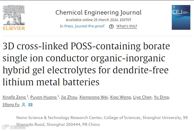 近日,来自上海大学付继芳副研究员(通讯作者)课题组,在国际知名期刊Chemical Engineering Journal上发表题为“3D Cross-linked POSS-containing Borate Single Ion Conductor Organic-inorganic Hybrid Gel Electrolytes for Dendrite-free Lithium Metal Batteries”的观点文章。
