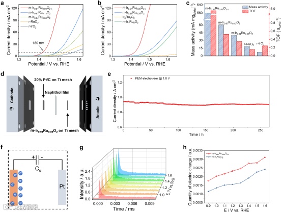 我们使用自搭建的TPS装置对催化剂表面的电荷分布动态进行了研究。催化剂中活性位点的氧化和表面氧化电荷的浓度会影响OER的速率。在短时间内(0.01 ms)在多个电位下对m-Ir0.91Ru0.09O2-δ和m-Ir1Ru0O2的响应电流进行积分得到电荷量(Q)。不论在哪个电位下m-Ir0.91Ru0.09O2-δ上所产生的电荷量均大于m-Ir1Ru0O2表面的电荷量,表明Ru的引入有利于增加活性位点上的氧化电荷数量,从而降低了OER的初始过电位。