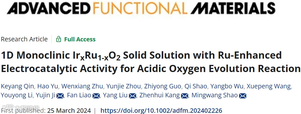 近日,来自苏州大学的邵名望教授、康振辉教授、刘阳教授、廖凡副研究员和纪玉金副教授,在国际知名期刊Advanced Functional Materials上发表题为“1D Monoclinic IrxRu1-xO2 Solid Solution with Ru-Enhanced Electrocatalytic Activity for Acidic Oxygen Evolution Reaction”的研究文章。该文章报道了一种新型一维单斜相氧化铱-钌固溶体(m-IrxRu1-xO2)。对于不同金属比例的m-IrxRu1-xO2,最佳的m-Ir0.91Ru0.09O2-δ催化剂在酸性条件下表现出优异的OER催化活性,在10 mA cm-2的电流密度下过电位仅为180 mV。当在室温下作用于PEM电解槽时,m-Ir0.91Ru0.09O2-δ催化剂在较低的负载量(0.1 mg cm-2),可在超过900 mA cm-2的电流密度下稳定运行256小时以上。