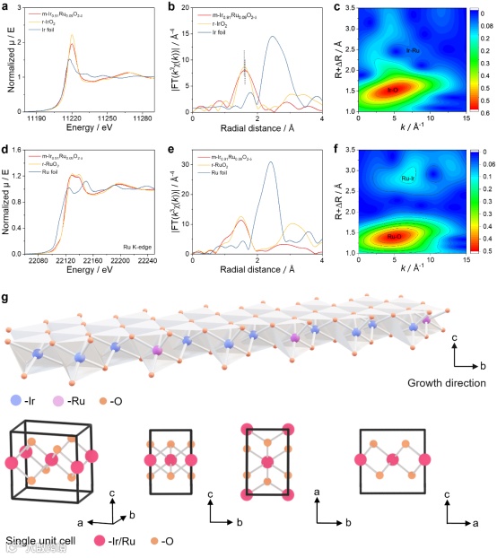 图2. m-Ir0.91Ru0.09O2-δ的同步辐射表征和结构以及单胞示意图。