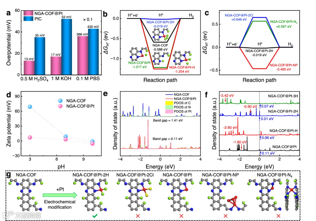 图6. 理论计算。(a)过电势;(b-c)台阶图;(d)Zeta电位,(e-f)态密度;(g)理论配位构形。