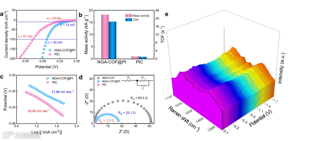 通过酸性条件下的性能测试,我们发现NGA-COF@Pt催化HER电流密度达到10 mA cm-2时的过电位为13 mV,优于商业20 wt.% Pt/C材料的23 mV,其中,当过电位为44 mV时,NGA-COF@Pt的质量比活性为18165 A gPt−1,周转频率(TOF)为18.4 s-1,是商业催化剂20 wt.% Pt/C的18倍。Tafel斜率证明了NGA-COF@Pt具有更优异的动力学;EIS证明了Pt的引入极大地优化了COF的电子导通能力;原位拉曼则证明了NGA-COF@Pt为催化剂而非预催化剂。