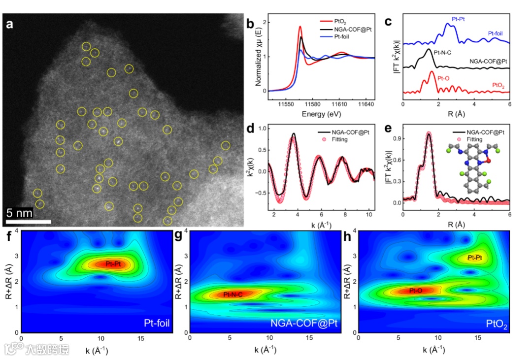 图3. NGA-COF@Pt配位环境表征。(a)球差电镜;(b-e)XANES、FT-EXAFS光谱及其结构拟合;(f-h) WT-EXAFS小波变换。