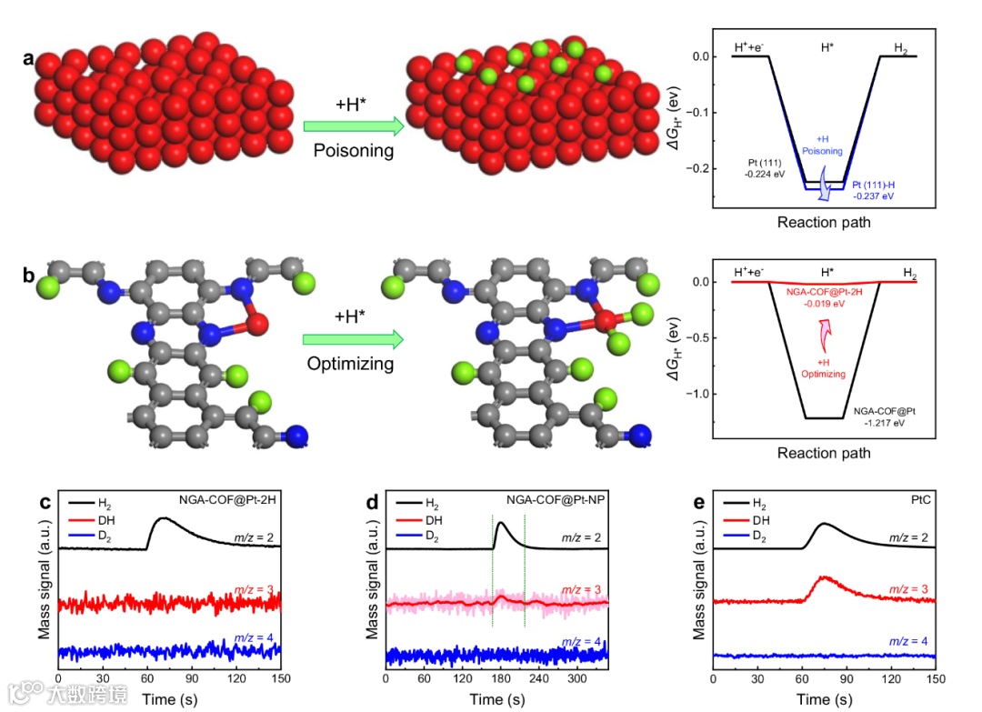 图7 毒化机理分析。(a)Pt(111)晶面被毒化和(b)Pt-N2单原子位点被优化的示意图和理论计算 ;(c-e)电化学原位差分质谱验证毒化机理。