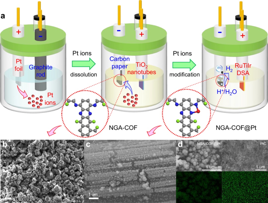 图2. Pt单原子的锚定。(a)电化学修饰法制备NGA-COF@Pt示意图;(b) NGA-COF和(c)NGA-COF@Pt阵列的SEM图像;(d)Pt元素EDS图。