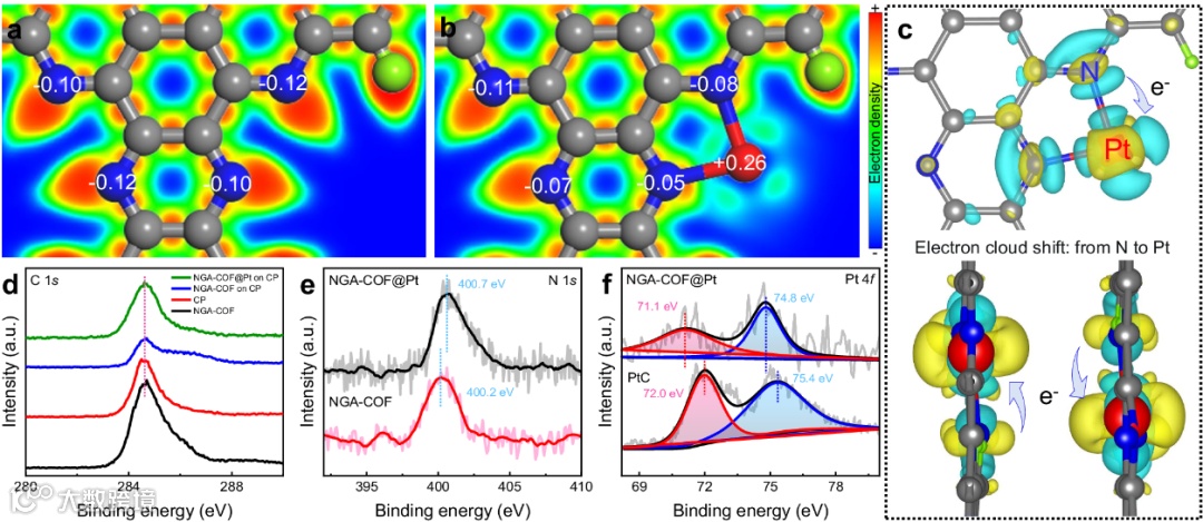 图4. NGA-COF@Pt电子相互作用。(a-b)ELF和Bader电荷分析;(c)差分电荷分析;(d)C1s;(e)N1s;(f)Pt4f 的XPS精细谱。
