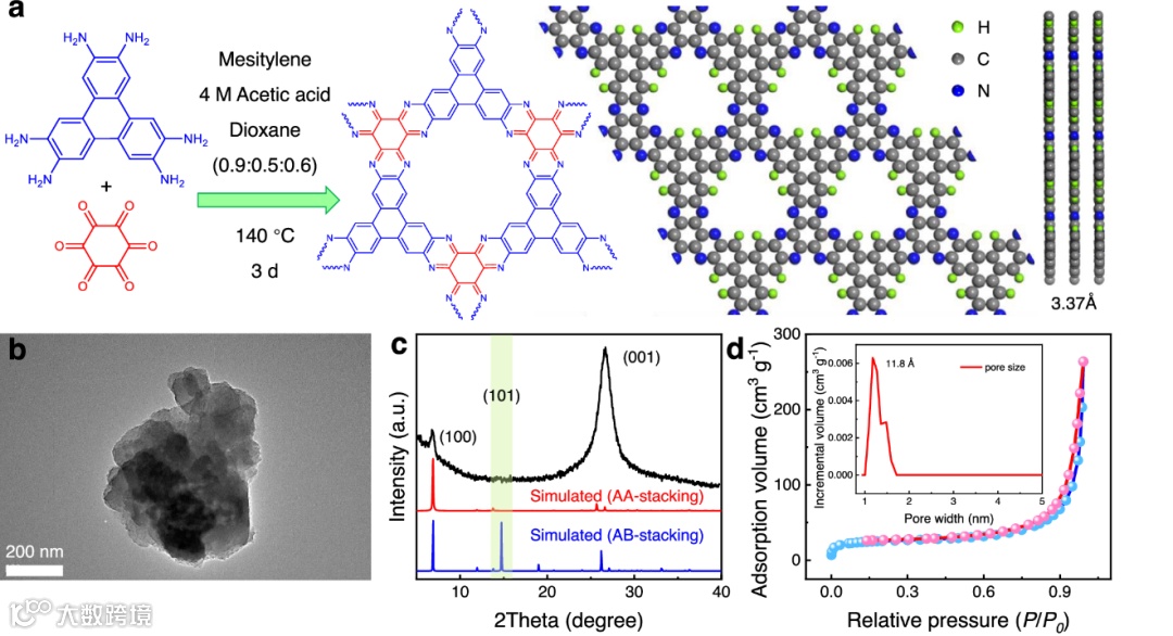 图1. NGA-COF的合成。(a)合成的示意图;(b)TEM图像;(c)XRD图谱;(d)氮气吸附和孔径分布。