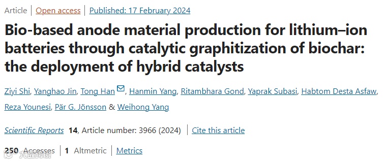近日,来自瑞典皇家理工学院的韩通博士在国际期刊Scientific Reports上发表题为“Bio-based anode material production for lithium-ion batteries through catalytic graphitization of biochar: the deployment of hybrid catalysts”的文章。该文章使用市场现有的生物炭作为原材料,并利用不同金属催化剂在石墨化过程中的协同效应,开发了一种新型三合金催化剂并对比其在催化石墨化中的表现。文章通过对石墨样品的综合分析,筛选出一种更高效的石墨化催化剂,并探索利用生物炭作为碳前体生产用于 LIB 的生物石墨的可能性。