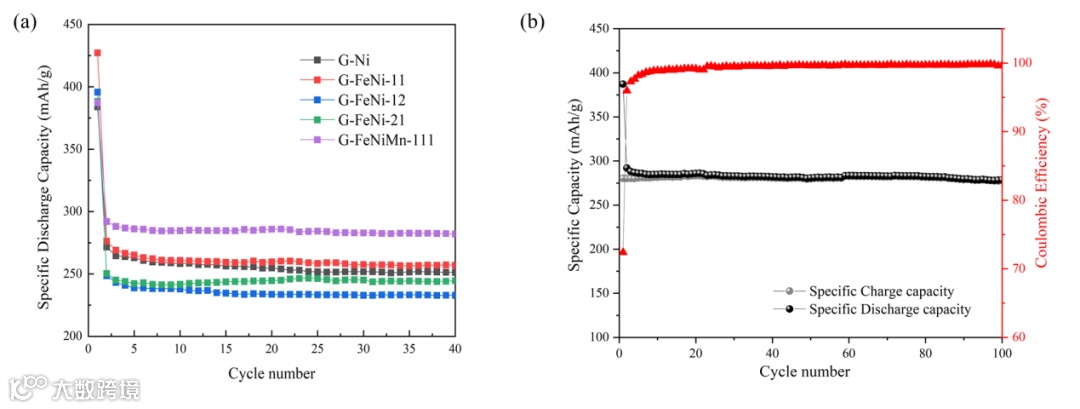 图2. (a) 不同生物石墨(单金属催化剂,双合金催化剂和三合金催化剂)的充放电循环表现;(b) 三合金催化剂生物石墨的长循环测试表现。
