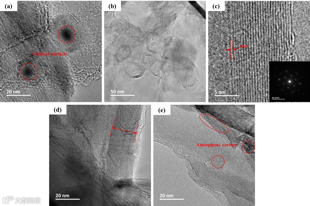 图1. 生物石墨(三合金催化剂)的HRTEM图片。(a) 酸洗前;(b) (c) (d) 和 (e) 酸洗后 。