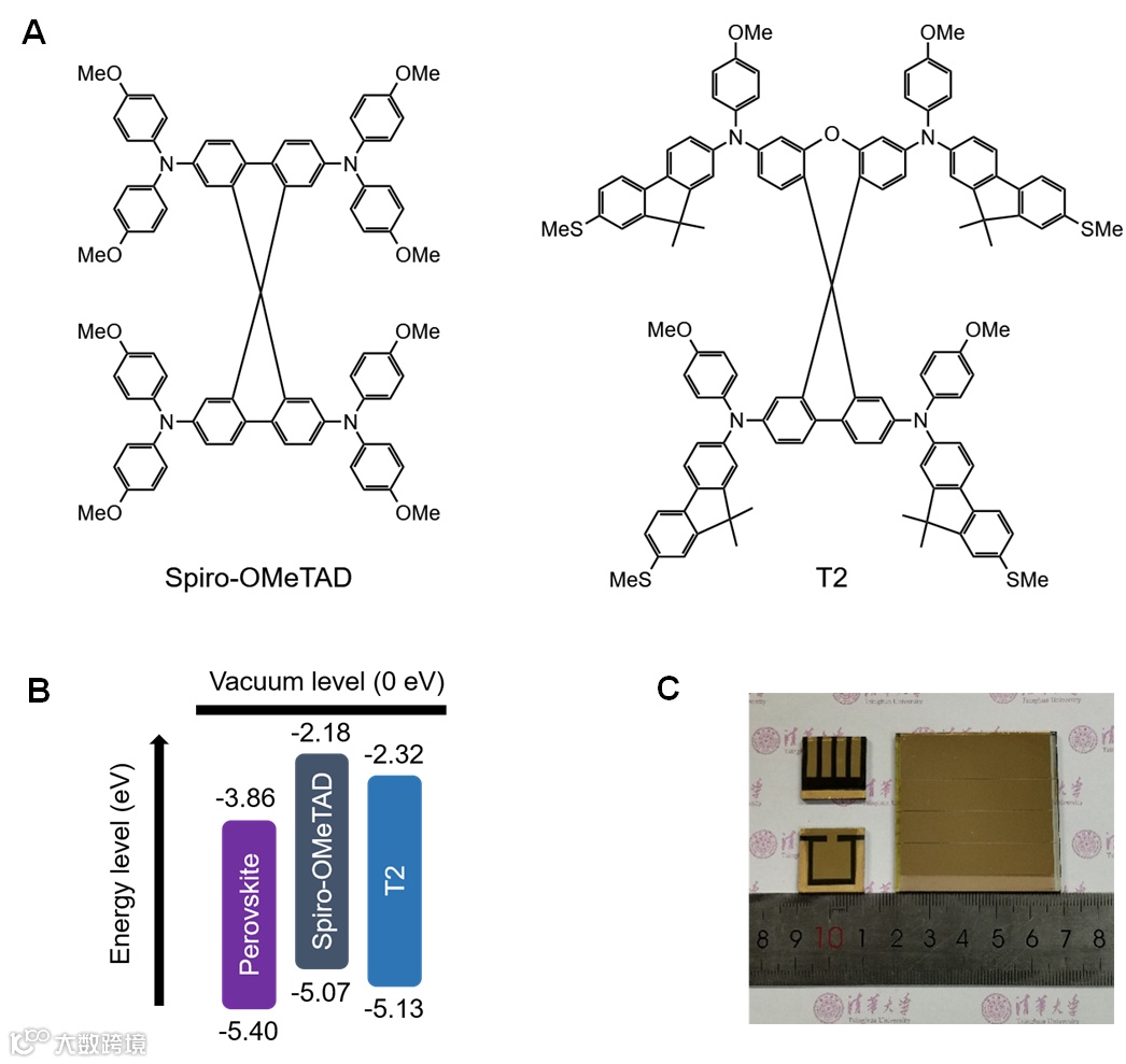 Spiro-OMeTAD和T2的化学结构及能级位置和基于T2制备的钙钛矿电池和组件照片