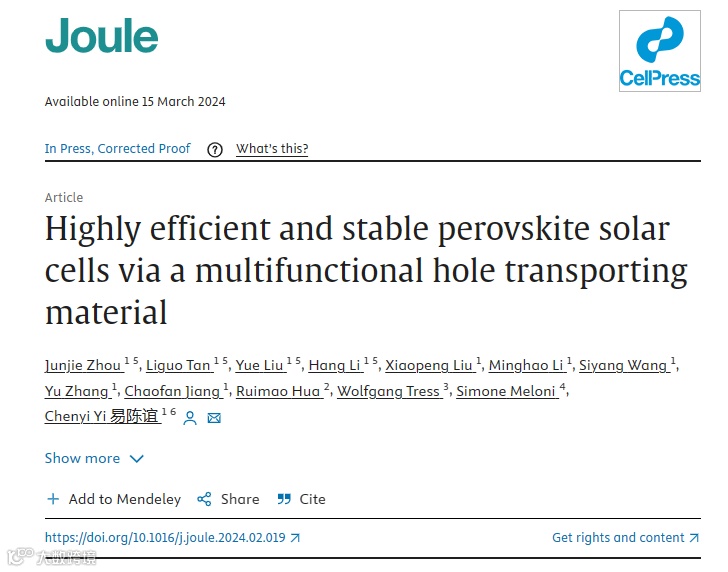 近日,上述研究成果以“通过多功能空穴传输材料实现高效率稳定钙钛矿太阳能电池”(Highly efficient and stable perovskite solar cells via a multifunctional hole transporting material) 为题发表于国际学术期刊《焦耳》(Joule)。文章链接https://www.sciencedirect.com/science/article/pii/S2542435124001028。论文共同第一作者是电机系博士生周俊杰、谭理国、刘越和李航;通讯作者是易陈谊;合作者包括清华大学化学系华瑞茂、瑞士苏黎世应用科技大学Wolfgang Tress、意大利费拉拉大学Simone Meloni等。