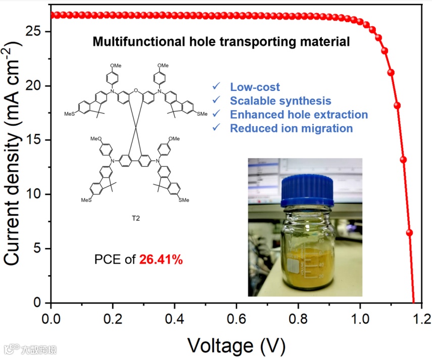 清华大学电机系易陈谊团队通过开发新的空穴传输材料结合真空蒸镀钙钛矿薄膜实现了26.41%的钙钛矿太阳能电池世界最高效率纪录。