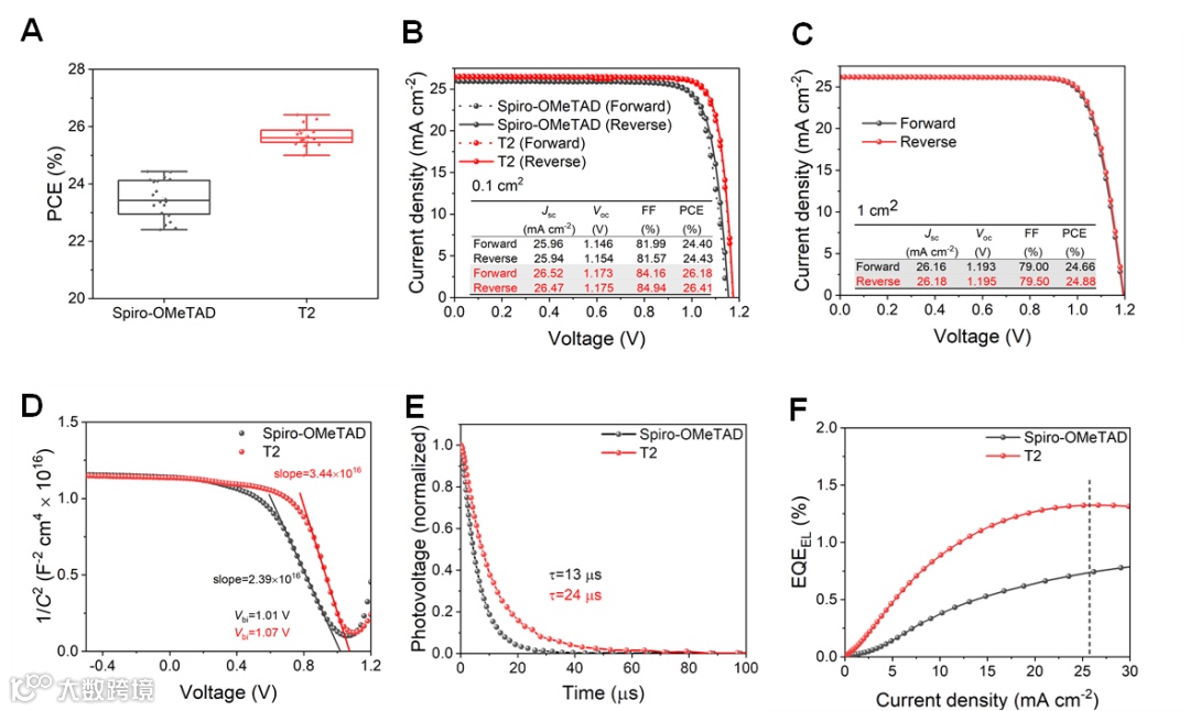 基于spiro-OMeTAD和T2制备的钙钛矿太阳能电池的测试结果