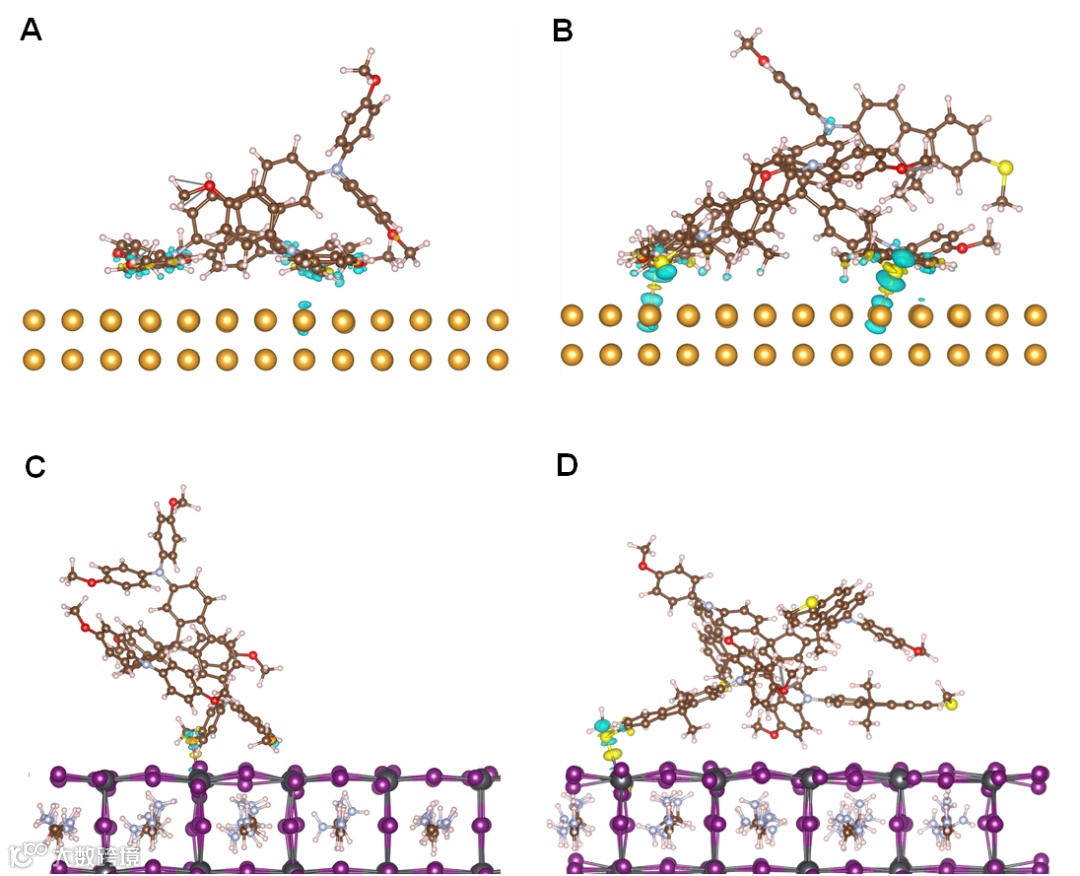 密度泛函理论(DFT)计算Spiro-OMeTAD(左排)和T2(右排)分别跟金(上排)和钙钛矿(下排)吸附的差分电荷密度