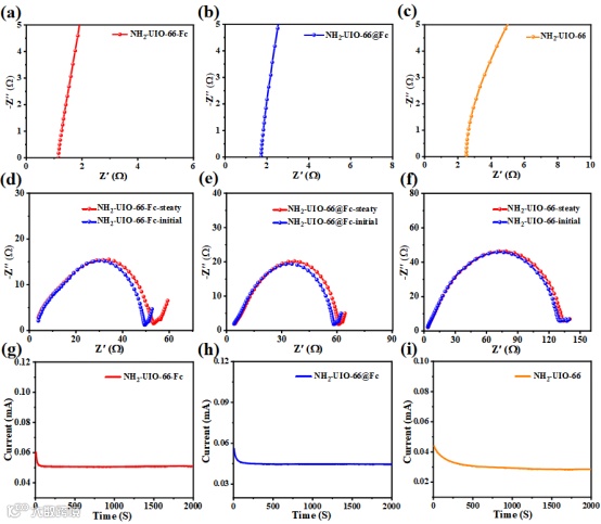 图 6.(a)NH2-UIO-66-Fc,(b)NH2-UIO-66@Fc和(c)NH2-UIO-66 SS||SS对称电池的离子电导率;(d)NH2-UIO-66-Fc,(e)NH2-UIO-66@Fc,(f)NH2-UIO-66的Li||Li对称电池的EIS曲线;(g)NH2-UIO-66-Fc,(h)NH2-UIO-66@Fc,(i)NH2-UIO-66的Li||Li对称电池计时电流曲线