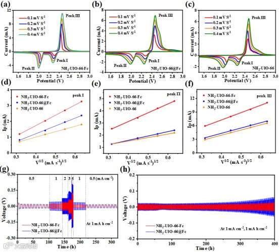 图 5.(a)NH2-UIO-66- Fc, (b) NH2-UIO-66@Fc和(c) NH2-UIO-66在不同扫描速率下的CV曲线;NH2-UIO-66- Fc, NH2-UIO-66@Fc和NH2-UIO-66的(d)第一次阴极还原过程,(e)第二次阴极还原过程和(f)阳极氧化过程的峰值电流(Ip)与扫描速率(ν1/2)的平方根图; NH2-UIO-66-Fc, NH2-UIO-66@Fc和NH2-UIO-66 Li| Li对称电池的(a)速率性能和(b)循环稳定性