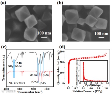 图2.(a)NH2-UIO-66和(b)NH2-UIO-66-Fc的SEM图像;(c)NH2-UIO-66-Fc和NH2-UIO-66@Fc的FTIR光谱;(d)NH2-UIO-66-Fc的N2吸附等温线和孔径分布