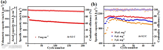 图 4.(a)硫载量为5 mg cm-2的NH2-UIO-66-Fc在0.2 C下的循环稳定性;( b ) NH2-UIO-66-Fc在0.2 C的贫电解液条件下的循环稳定性