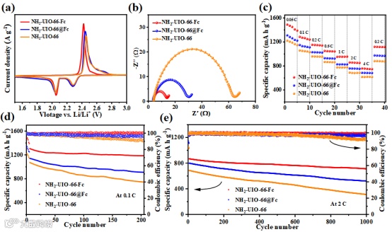图3. NH2-UIO-66-Fc, NH2-UIO-66@Fc和NH2-UIO-66的(a)CV曲线;(b)EIS图;(c)倍率性能;(d)短期循环稳定性;(e)长期循环稳定性