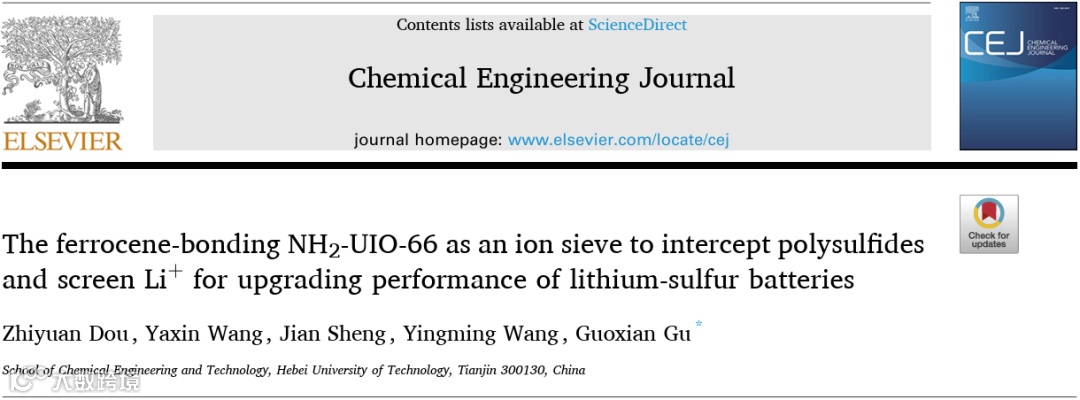 近日,来自河北工业大学的古国贤副教授,在国际知名期刊Chemical Engineering Journal上发表题为“The ferrocene-bonding NH2-UIO-66 as an ion sieve to intercept polysulfides and screen Li+ for upgrading performance of lithium-sulfur batteries”的观点文章。