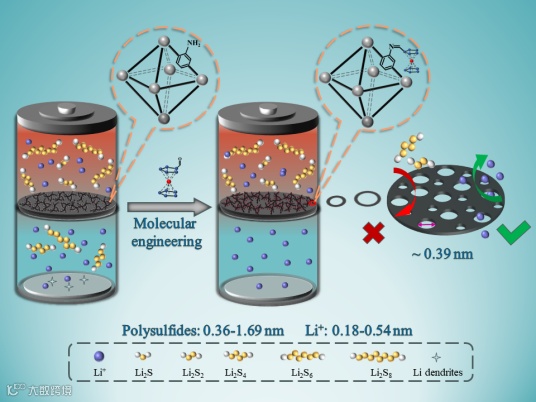 这项工作是通过调整孔径和孔表面化学来合理设计NH2-UIO-66材料以提高Li-S电池的电化学性能。二茂铁的引入使NH2-UIO-66的孔径从5.1 Å减小到3.9 Å,从而在分子水平上阻挡多硫化物阴离子并穿透锂阳离子。而且,二茂铁中带负电荷的环戊二烯基配体可以通过阳离子-π相互作用与多硫化物中的锂离子发生作用,从而抑制多硫化物穿梭。载有NH2-UIO-66-Fc功能化隔膜的锂硫电池表现优异的循环稳定性,并且在高载硫或者贫电解液条件下性能仍然保持良好。