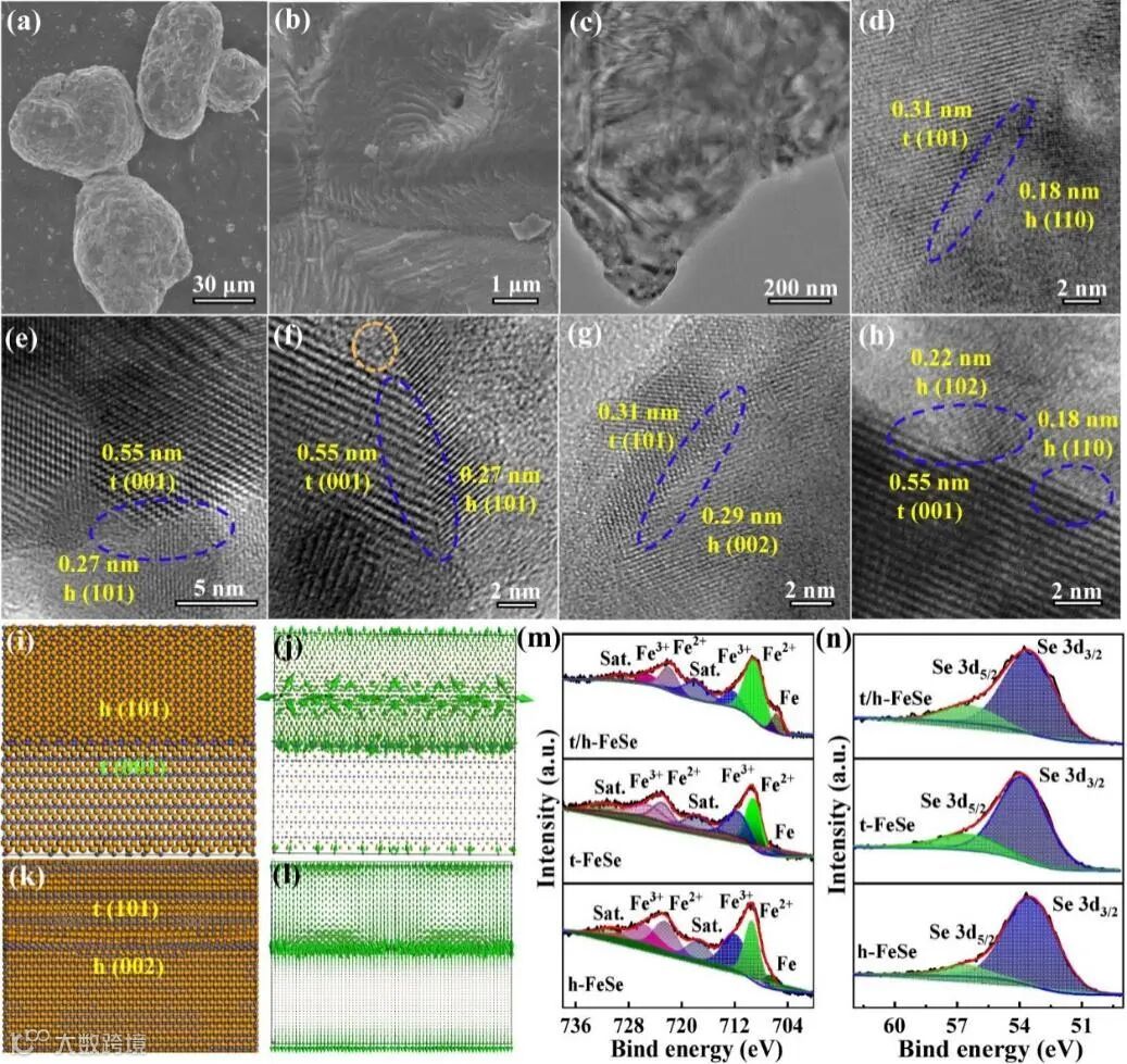 通过对材料进行SEM、TEM表征,证实了t/h-FeSe尺寸为30-60μm的块体,并由具有致密表面的层状结构组成。采用HRTEM,证实了丰富异质界面和额外活性位点的形成,有利于提高电化学反应活性,增加电荷转移,并促进电解质离子在充电和放电过程中的扩散,提升电化学性能。选取不同晶体取向的两个晶粒边界进行模型优化,通过分子动力学(MD)模拟揭示异质结构中应变分布和缺陷的产生,证实了界面的紧密接触和良好耦合。