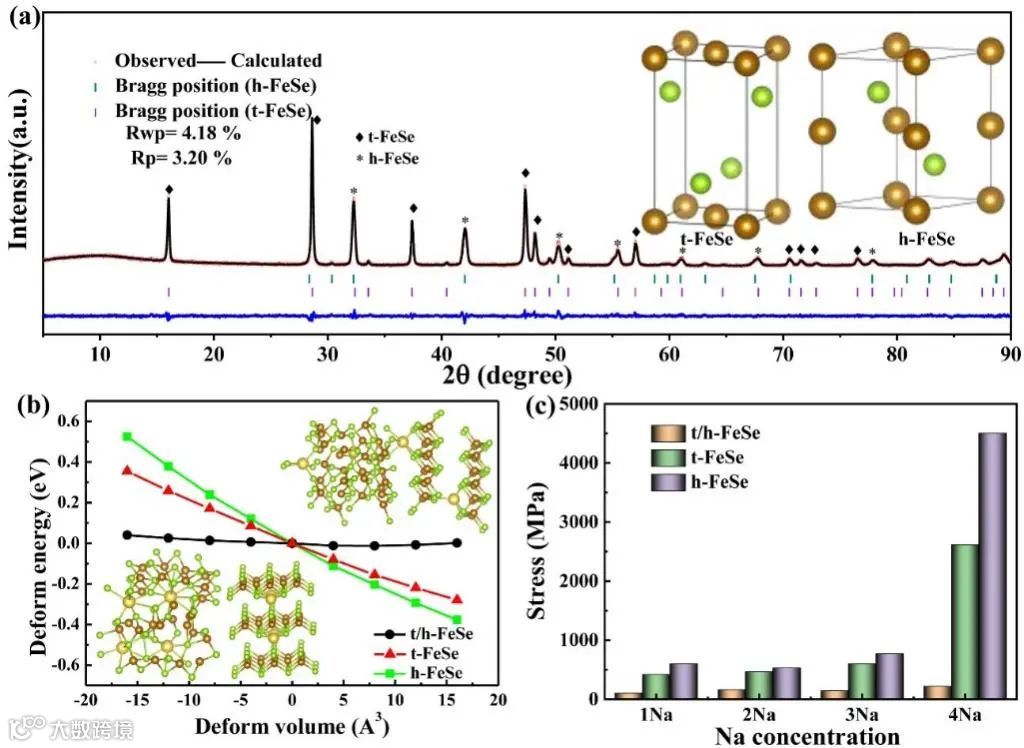 通过控制热处理参数,制备得到同源异质结构FeSe (t/h-FeSe)。采用XRD精修,证实了t/h-FeSe中 t-FeSe 和 h-FeSe 的含量分别为61.6% 和38.4% 。采用 Williamson-Hall 法研究了异质结构形成后的两相体积膨胀,其中t 相体积膨胀为0.14% ,h 相体积膨胀为0.36% ,表明异质结构相由适度应力应变的两相组成,该结构的形成有利于提高电化学反应过程中氧化还原反应的可逆性,且能提升材料的自身结构稳定性。通过DFT研究了 t/h-FeSe、 t-FeSe 和 h-FeSe 嵌入不同浓度Na后的应变能,证实了t/h-FeSe 的优越抗应变能力和良好的自适应结构。