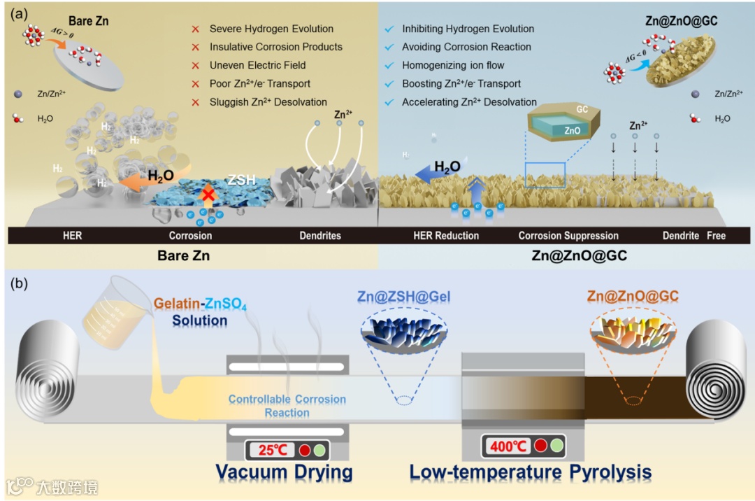 图1. a) 纯锌负极(左)和 Zn@ZnO@GC 负极(右)上的锌沉积行为示意图。b) Zn@ZnO@GC 负极制造过程示意图。